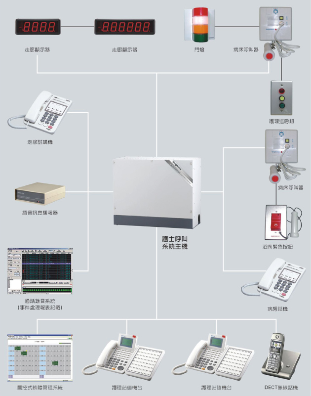 室內互呼、雙向對講、廣播呼叫、緊急求救、RFID感應操作、保全迴路顯示。