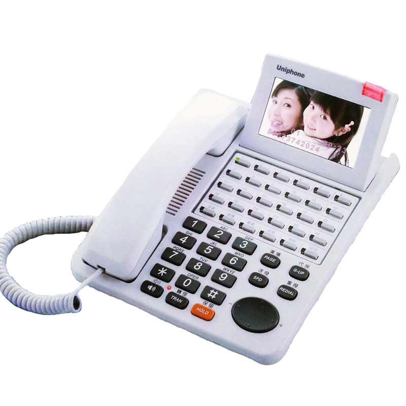 內/外線免持對講,64 字元(32 字元中文) 4 行背光大型 LCD 顯示,雙色大型來電指示燈,24 外線鍵6 功能鍵,共 30 個可程式功能鍵。