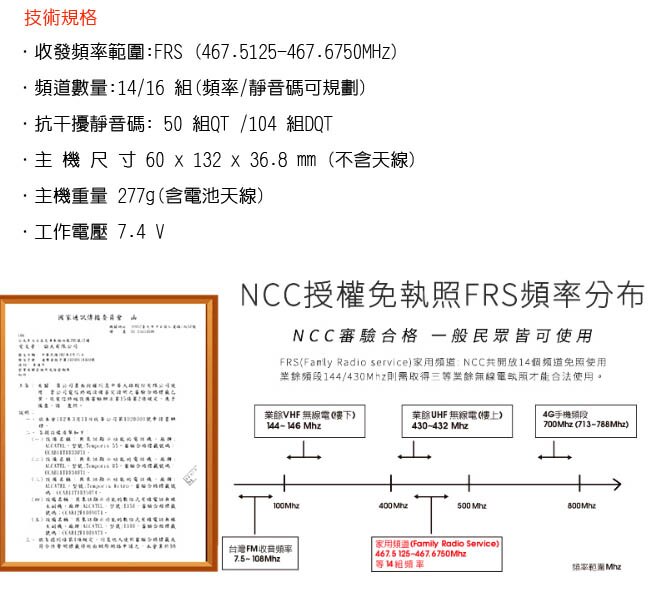 - 收發頻率範圍:FRS (467.5125-467.6750MHz)