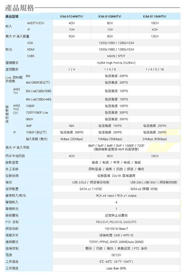 KIM- 9104/9108/9216 HK 4/ 8/ 16 CH 混合式500萬畫素數位監控主機